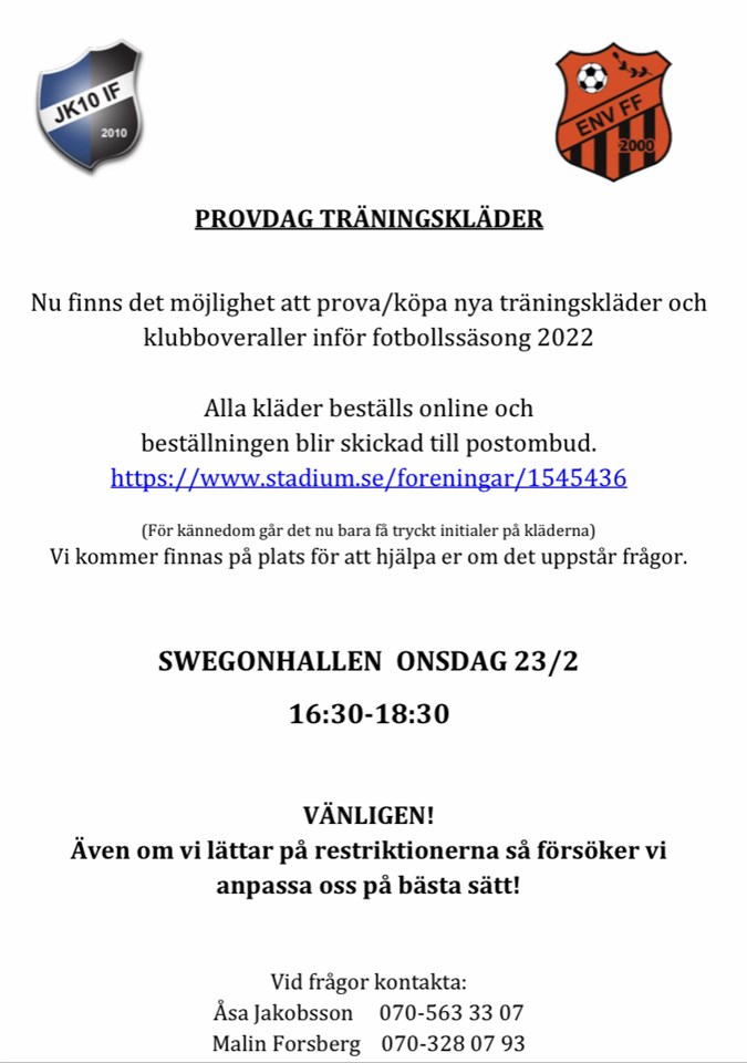 Nu finns det möjlighet att prova/köpa nya träningskläder och klubboveraller inför fotbollssäsong 2022 Alla kläder beställs online och beställningen blir skickad till postombud. https://www.stadium.se/foreningar/1545436 (För kännedom går det nu bara få tryckt initialer på kläderna) Vi kommer finnas på plats för att hjälpa er om det uppstår frågor. SWEGONHALLEN ONSDAG 23/2 16:30-18:30 VÄNLIGEN! Även om vi lättar på restriktionerna så försöker vi anpassa oss på bästa sätt! Vid frågor kontakta: Åsa Jakobsson 070-563 33 07 Malin Forsberg 070-328 07 93 P-12 11 feb 2022 0kommentarer